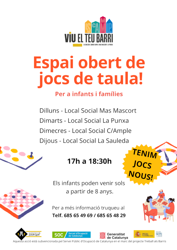 Vine a gaudir d'una tarda de jocs de taula al local social del teu barri! Aquest espai obert està pensat perquè infants a partir de 8 anys puguin venir sols o acompanyats de la família.