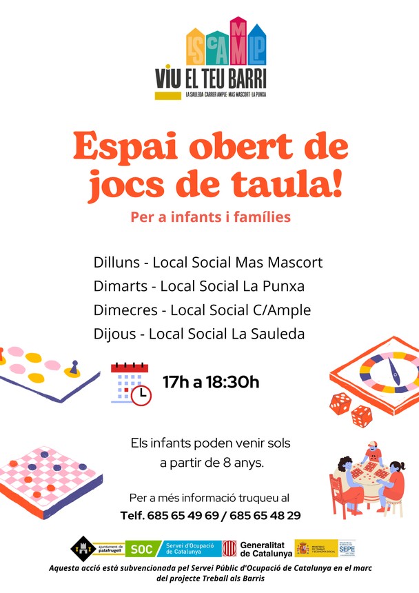 Vine a gaudir d'una tarda de jocs de taula per a infants i famílies. Els infants poden venir sols a partir de 8 anys. Per a més informació, truqueu al 685 65 49 69 o al 685 65 48 29.