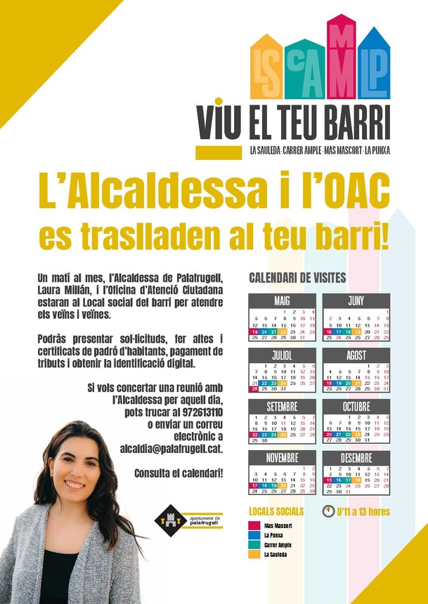 Un matí al mes l'Alcaldessa, Laura Millán, i l'Oficina d'Atenció Ciutadana (OAC) estaran al Local social del barri per atendre els veïns i veïnes.