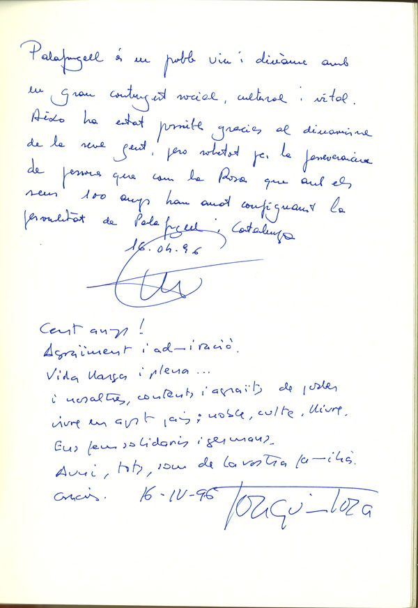 Cent anys! Agraiment i admiració. Vida llarga i plena ... i nosaltres, contents, i agraïts, de poder viure en aquest país; noble, culte, lliure. Ens fem solidaris i germans. Avui, tots, som de la vostra família. Gràcies.